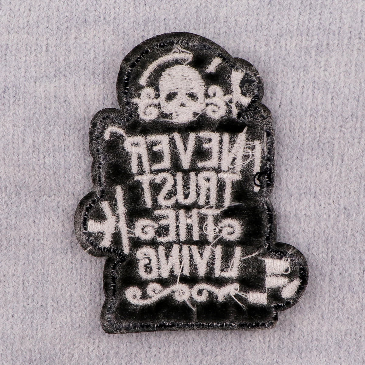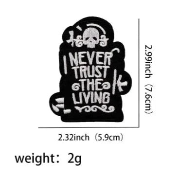 We recommend sewing on this Beetlejuice 'Never Trust The Living' Embroidered Patch for jackets, vests and heavy duty use. This Beetlejuice 'Never Trust The Living' Embroidered Patch can be ironed on to denim items.