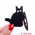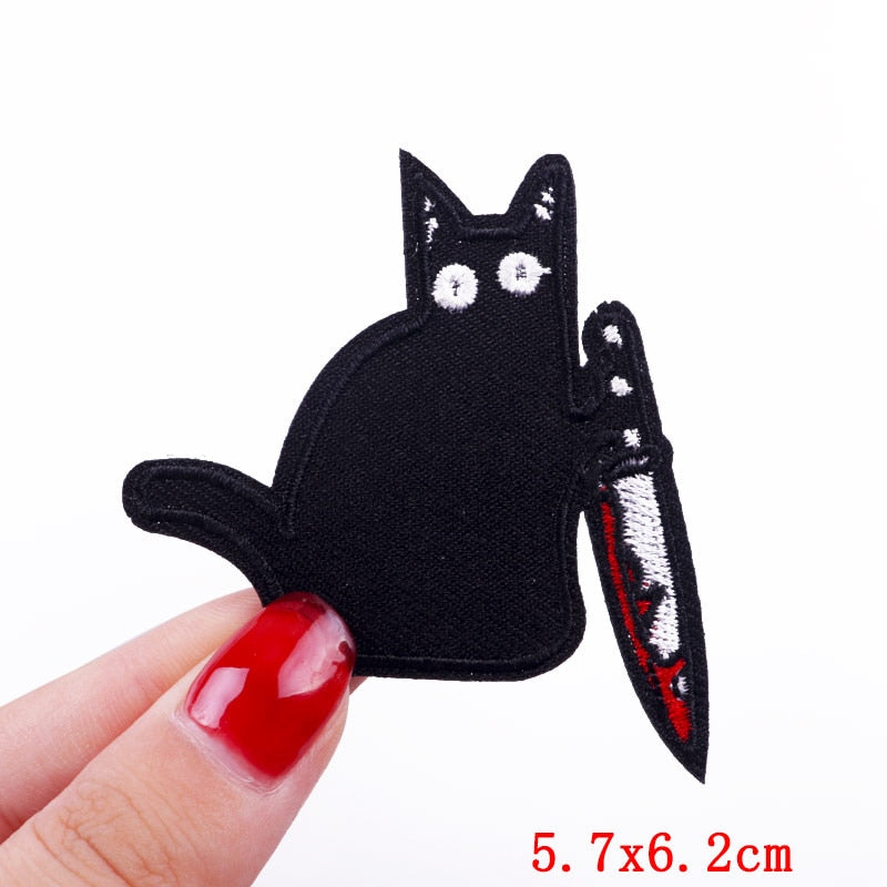 We recommend sewing on this Black Cat 'Bloody Knife In Hand' Embroidered Patch for jackets, vests and heavy duty use. This Black Cat 'Bloody Knife In Hand' Embroidered Patch can be ironed on to denim items.