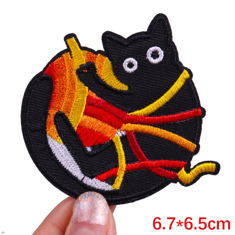 We recommend sewing on this Black Cat 'Tangled In Yarn' Embroidered Patch for jackets, vests and heavy duty use. This Black Cat 'Tangled In Yarn' Embroidered Patch can be ironed on to denim items.
