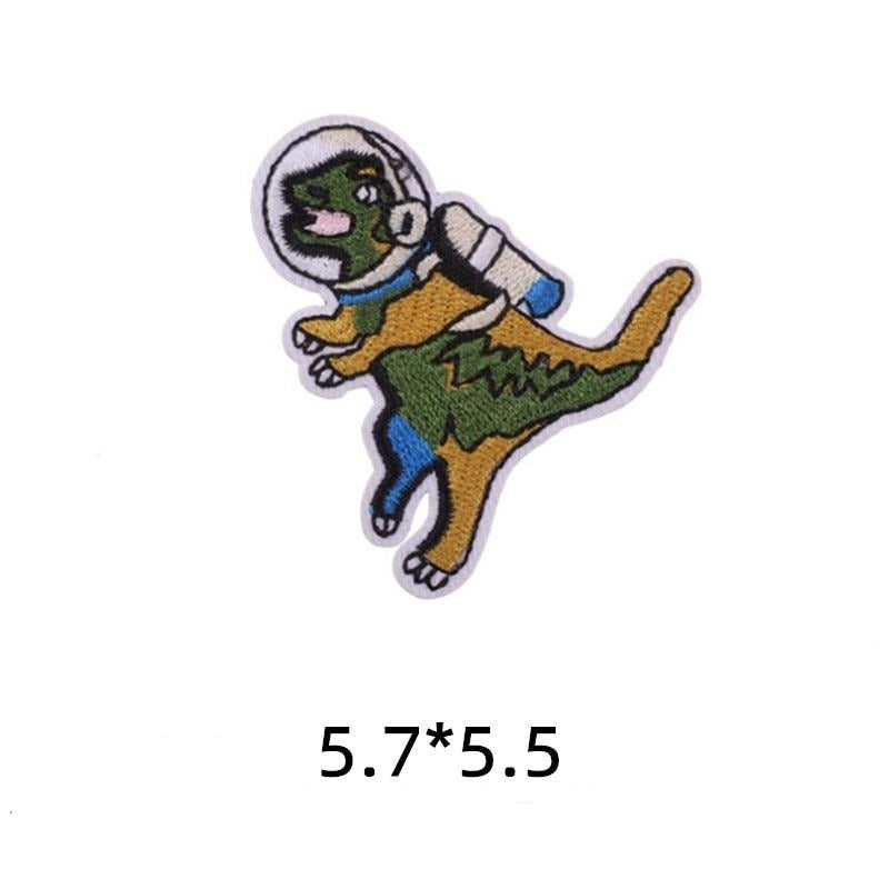 We recommend sewing on this Dinosaur 'Dino Astronaut' Embroidered Sew Iron On Patch for jackets, vests and heavy duty use. This Dinosaur 'Dino Astronaut' Embroidered Sew Iron On Patch can be ironed on to denim items.