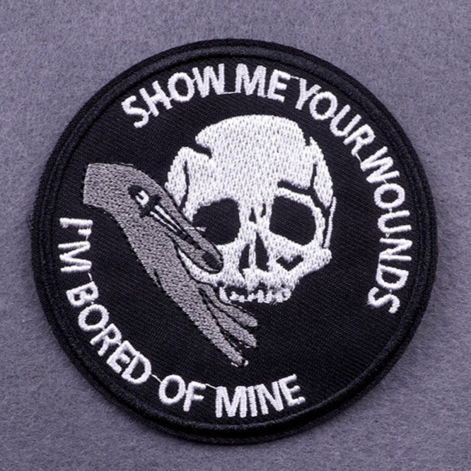 Hand And Skull 'Show Me Your Wounds | I'm Bored Of Mine' Embroidered Patch Description: