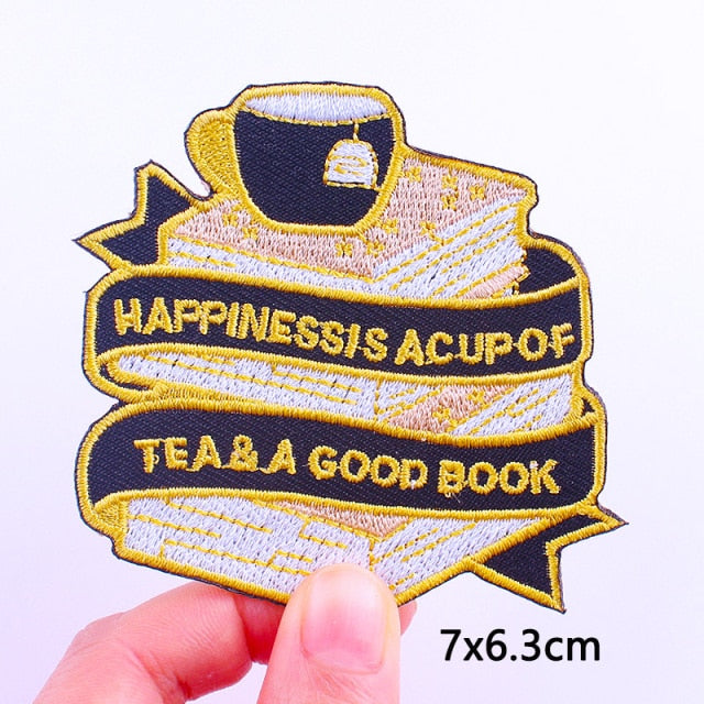 Order your Happy Quotes 'Happiness Is A Cup Of Tea & A Good Book' Embroidered Sew Iron On Patch today!