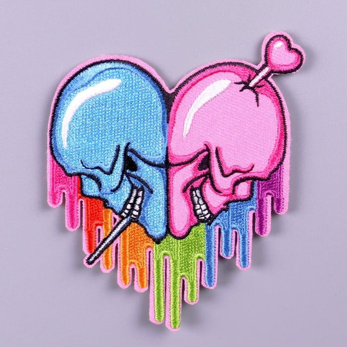 We recommend sewing on this Heart Shaped 'Skulls | Rainbow Paint Flow' Embroidered Patch for jackets, vests and heavy duty use. This Heart Shaped 'Skulls | Rainbow Paint Flow' Embroidered Patch can be ironed on to denim items.