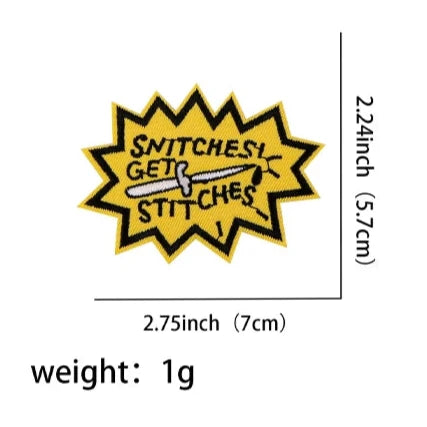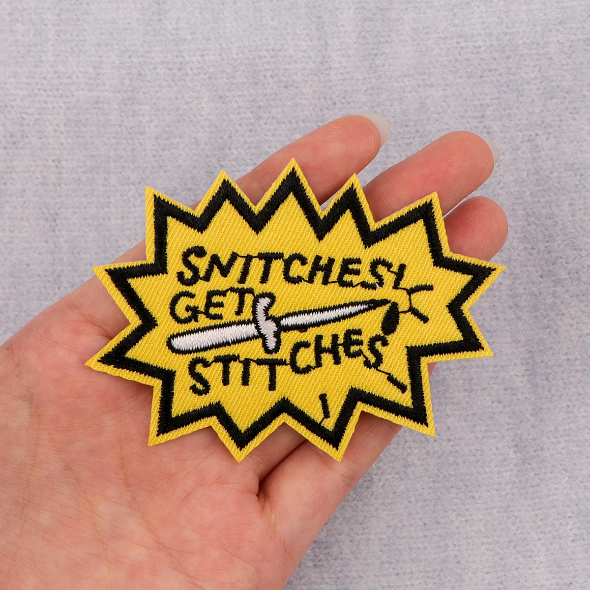 Turn some heads with our Knife 'Snitches Get Stitches' Embroidered Patch! Our Knife 'Snitches Get Stitches' Embroidered Patch is great for adding to denim jackets, bags, and more. Our Knife 'Snitches Get Stitches' Embroidered Patch is made for the most demanding of necessities.