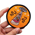 We recommend sewing on this Lightyear 'UFO | Pizza' Embroidered Patch for jackets, vests and heavy duty use. This Lightyear 'UFO | Pizza' Embroidered Patch can be ironed on to denim items.