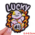 We recommend sewing on this Lucky 'Cat Holding Skull' Embroidered Patch for jackets, vests and heavy duty use. This Lucky 'Cat Holding Skull' Embroidered Patch can be ironed on to denim items.