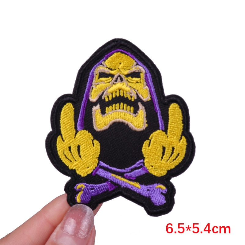 We recommend sewing on this Masters of the Universe 'Skeletor | F*ck U' Embroidered Patch for jackets, vests and heavy duty use. This Masters of the Universe 'Skeletor | F*ck U' Embroidered Patch can be ironed on to denim items.
