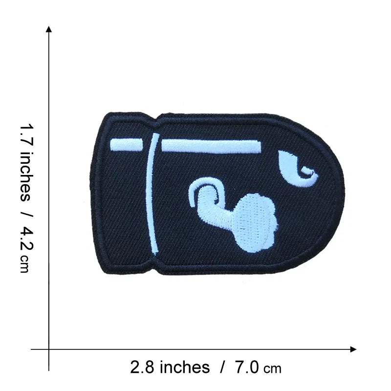 We recommend sewing on this Mushroom Kingdom Bros. 'Bullet Bill' Embroidered Patch for jackets, vests and heavy duty use. This Mushroom Kingdom Bros. 'Bullet Bill' Embroidered Patch can be ironed on to denim items.
