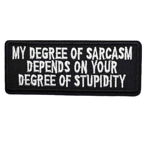 Turn some heads with our 'My Degree Of Sarcasm Depends On Your Degree Of Stupidity' Embroidered Patch! Our 'My Degree Of Sarcasm Depends On Your Degree Of Stupidity' Embroidered Patch is great for adding to denim jackets, bags, and more. Our 'My Degree Of Sarcasm Depends On Your Degree Of Stupidity' Embroidered Patch is made for the most demanding of necessities.