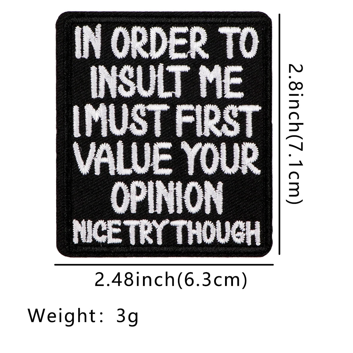 Nice Try Though ‘To Insult Me I Must Value Your Opinion’ Embroidered Patch Description: