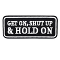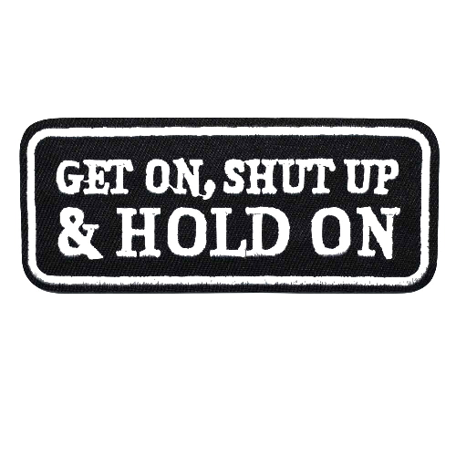 Turn some heads with our Quote 'Get On, Shut Up And Hold On' Embroidered Patch! Our Quote 'Get On, Shut Up And Hold On' Embroidered Patch is great for adding to denim jackets, bags, and more. Our Quote 'Get On, Shut Up And Hold On' Embroidered Patch is made for the most demanding of necessities.