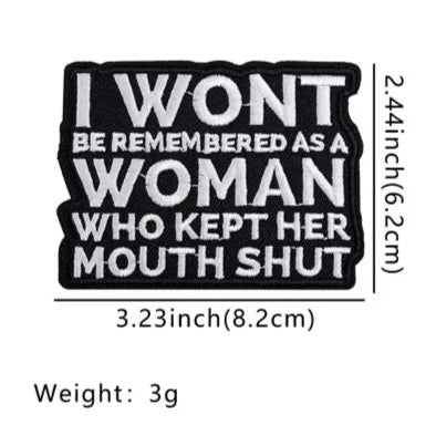 Quote 'I Wont Be Remembered As A Woman Who Kept Her Mouth Shut' Embroidered Patch Description: