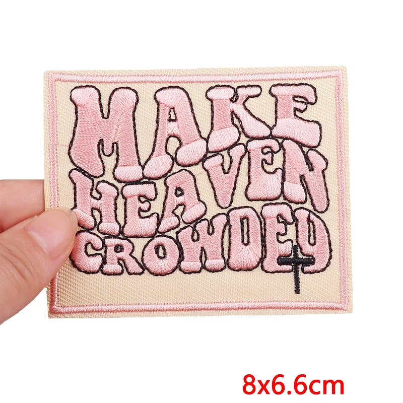 We recommend sewing on this Quote 'Make Heaven Crowded' Embroidered Patch for jackets, vests and heavy duty use. This Quote 'Make Heaven Crowded' Embroidered Patch can be ironed on to denim items.