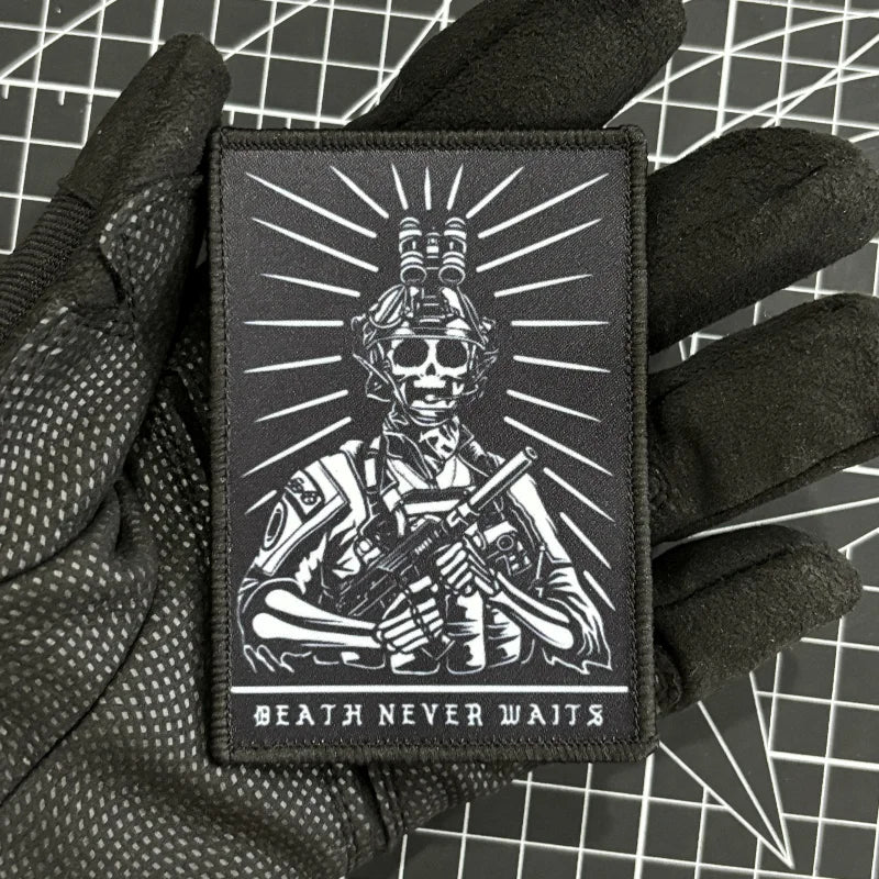 Turn some heads with our Skull Soldier 'Death Never Waits' Embroidered Velcro Patch! Our Skull Soldier 'Death Never Waits' Embroidered Velcro Patch is great for adding to denim jackets, bags, and more. Our Skull Soldier 'Death Never Waits' Embroidered Velcro Patch is made for the most demanding of necessities.
