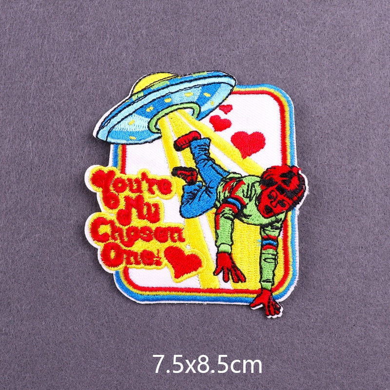 We recommend sewing on this Space 'You're My Chosen One | UFO Abduction' Embroidered Patch for jackets, vests and heavy duty use. This Space 'You're My Chosen One | UFO Abduction' Embroidered Patch can be ironed on to denim items.