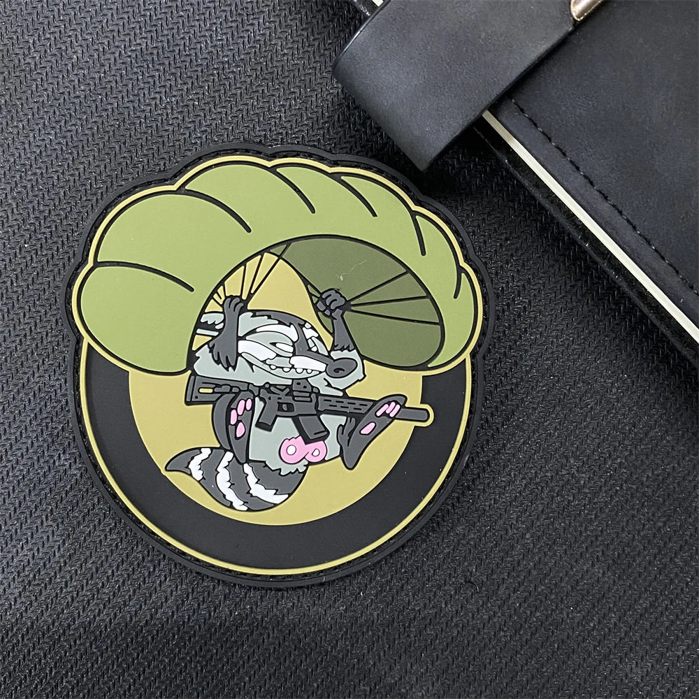 Tactical Raccoon 'Parachute' PVC Rubber Velcro Patch Description: