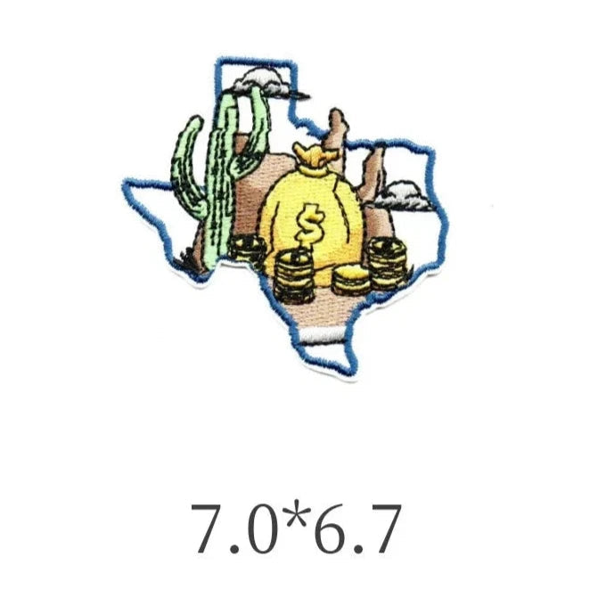 We recommend sewing on this Texas Map 'Money Bag' Embroidered Patch for jackets, vests and heavy duty use. This Texas Map 'Money Bag' Embroidered Patch can be ironed on to denim items.