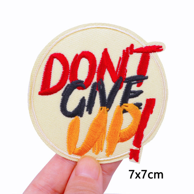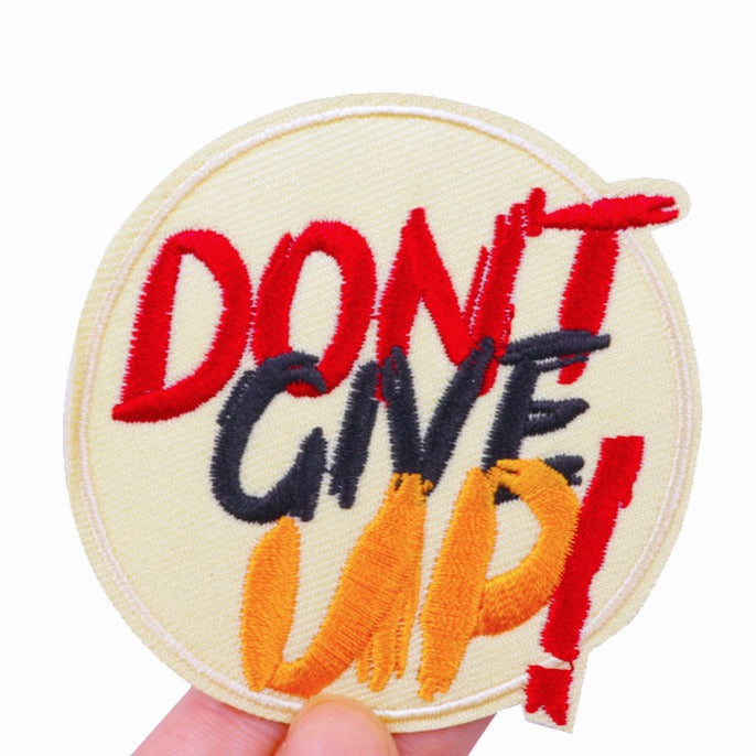 We recommend sewing on this Tricolor 'Don't Give Up!' Embroidered Patch for jackets, vests and heavy duty use. This Tricolor 'Don't Give Up!' Embroidered Patch can be ironed on to denim items.